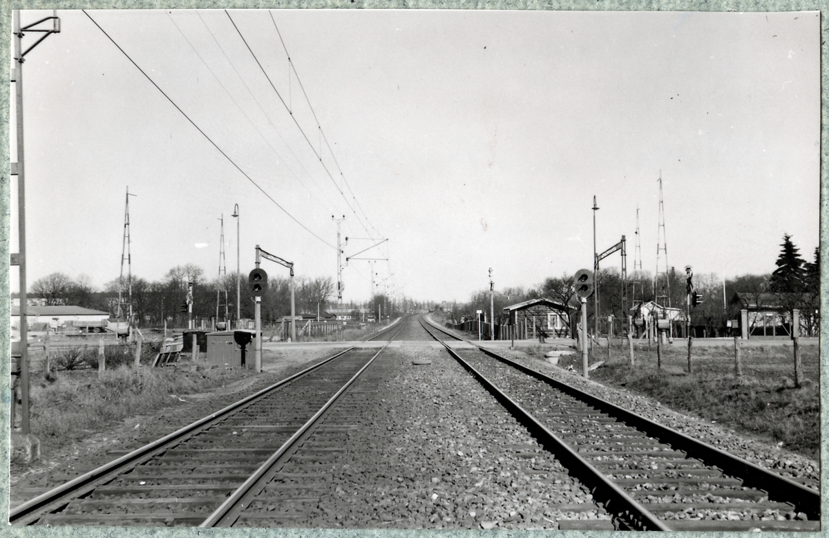 Järnvägsövergång sedd från spåret i Malmö 1959 på Industrigatan.