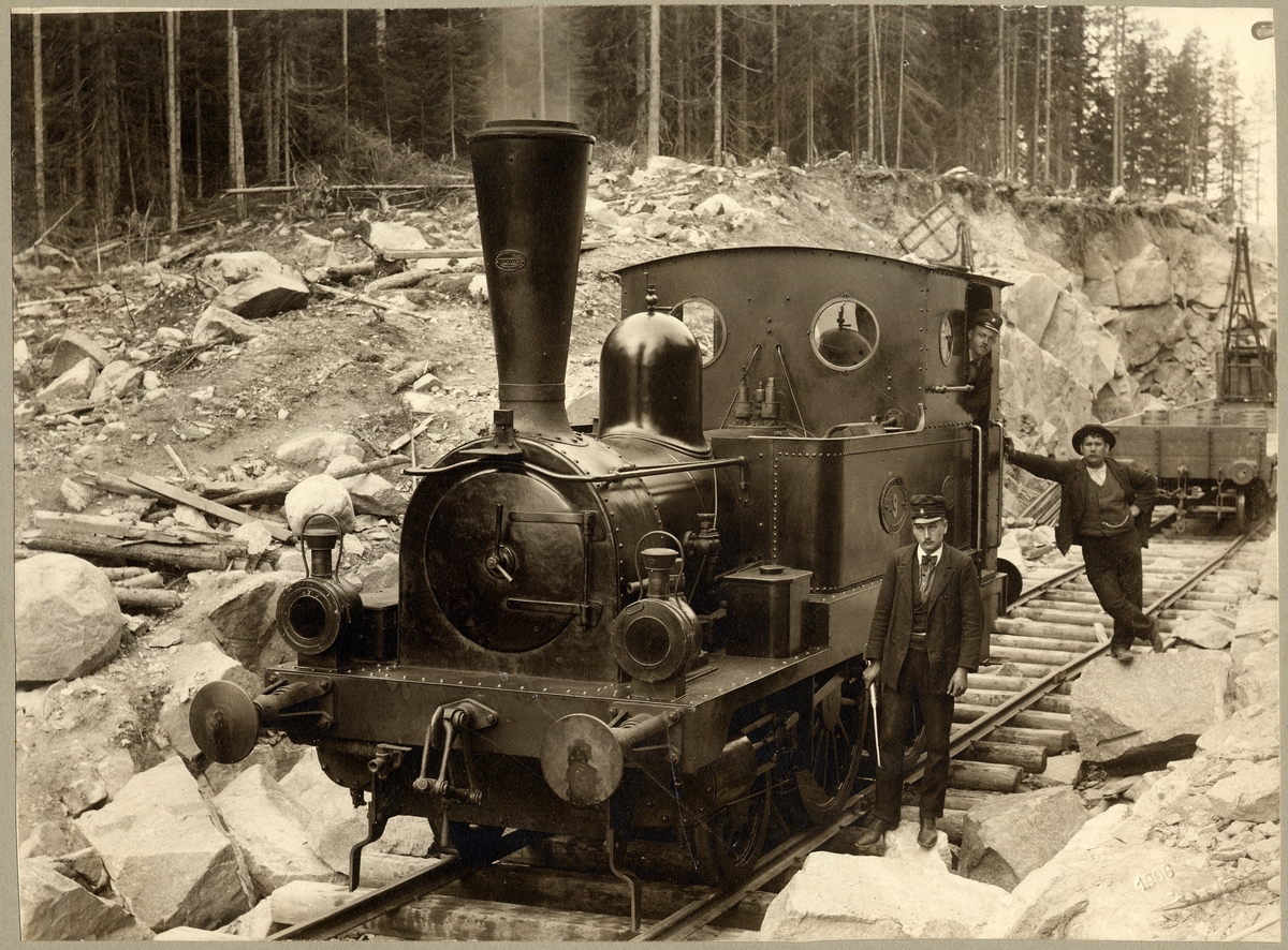 SWB P 9 från Skärklacken 1906. Lokeldare Sven Erik Nilsson född 6/11 1881, Lokförare Karl August Pettersson född 13/4 1878 död i Västerås 26/7 1957 Förman Olof Sandell.
