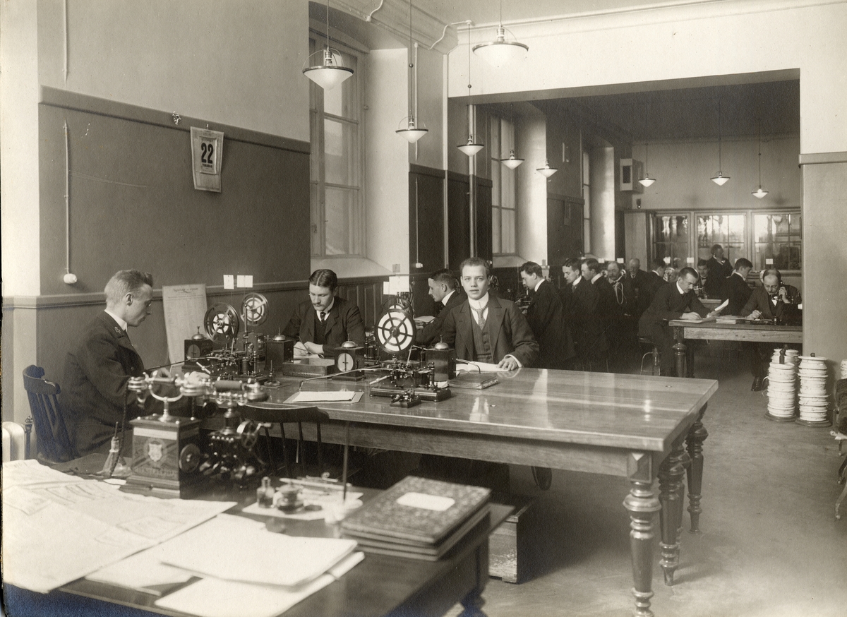 Telegrafexpeditionen Stockholm Central 22/12 1910. Fr.v. vid apparatborden; Stk Malmqvist, Kb Eskil Svensson, Stk Linder, eo Sts Rudolf Skeppstedt, Kb Albihn, ex skrivbitr Zandén, eo Stk Blomberg, Sts Christensson,verkmäst. Santesson, Kb Alb. Carlsten, eo Stk Danielsson, Tlt Ågren,telbud Berggren, Tågledarna vid skrivbordet till vänster är G Dahlström och Nylinder.
