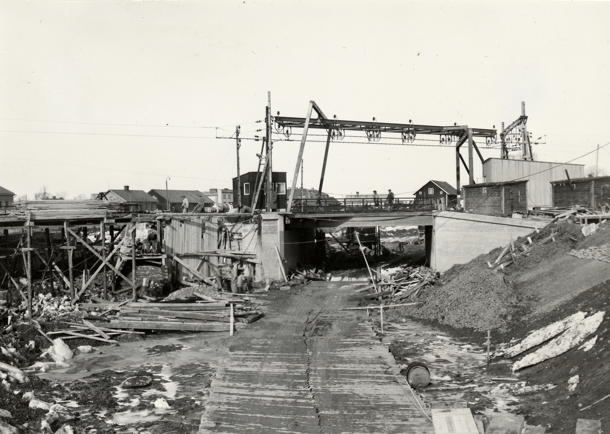 Situationsbild från grävningarna vid klaffbron över Göta Kanal vid Töreboda. Bilden tagen österifrån i början av mars 1950