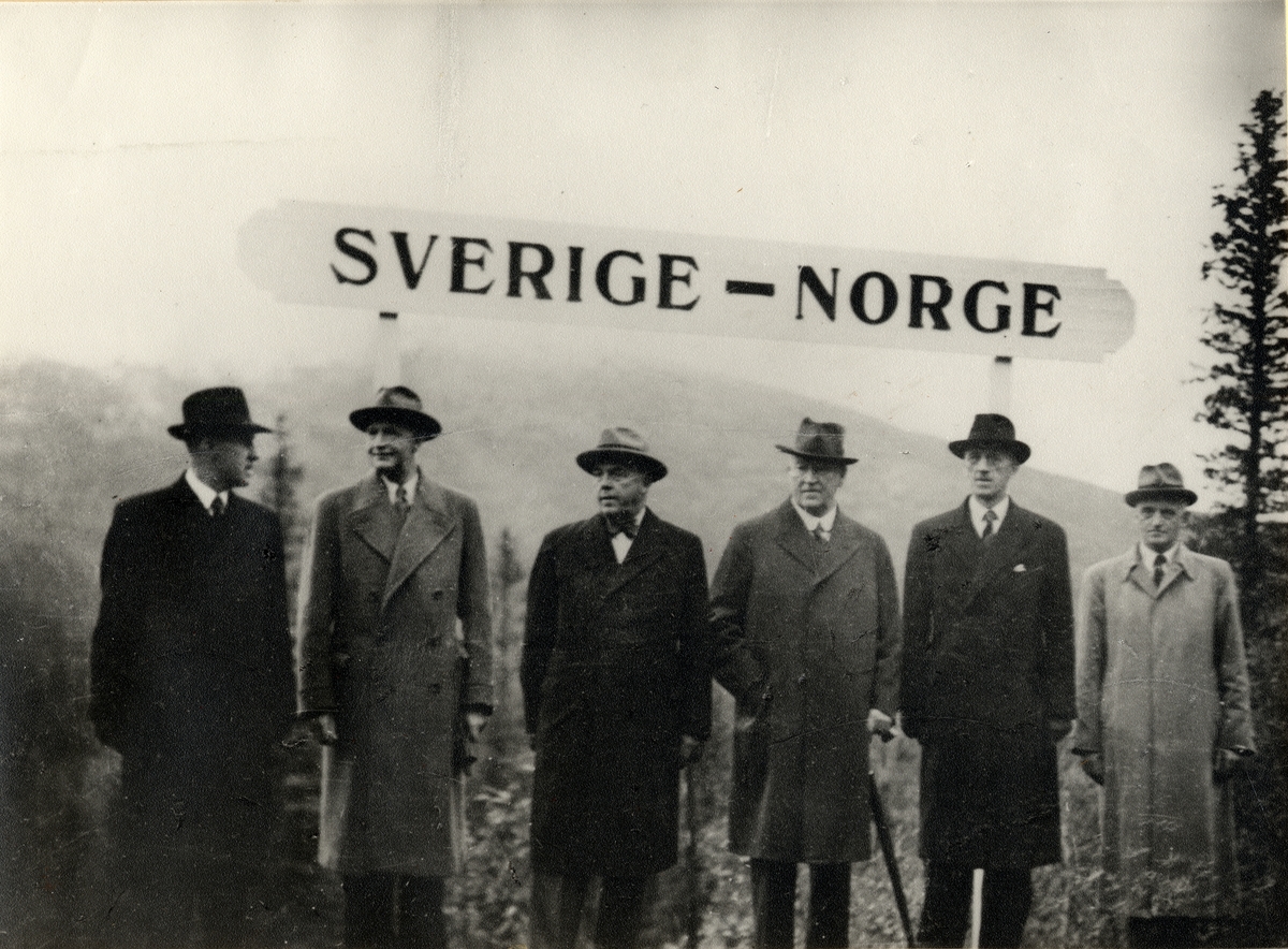 Invigning av elektrifieringen Storlien-Järpen 29/9 1945. Fr.v. Dc Dahlberg, landshövding Löfgren, Gd Dahlbeck, Gd Granholm, Gd Lökken Oslo, de Nyhus Trondheim