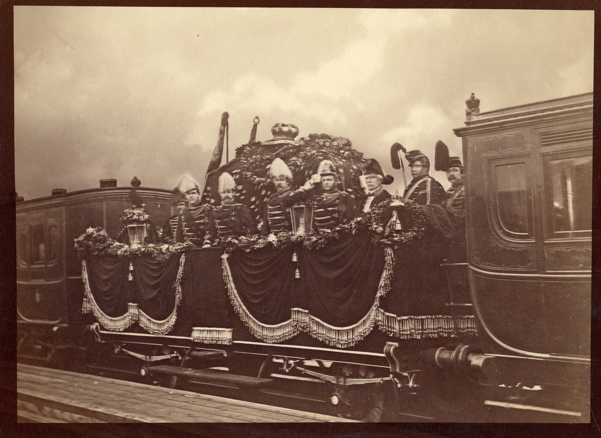 Carl XV:s likfärd Malmö-Stockholm september 1872. Fotot taget under tågets uppehåll å Katrineholms station. Officerarna äro från vänster; prins Louis Murat, baron Bror Cederström, baron Gillis Bildt, greve Axel Cronshielm