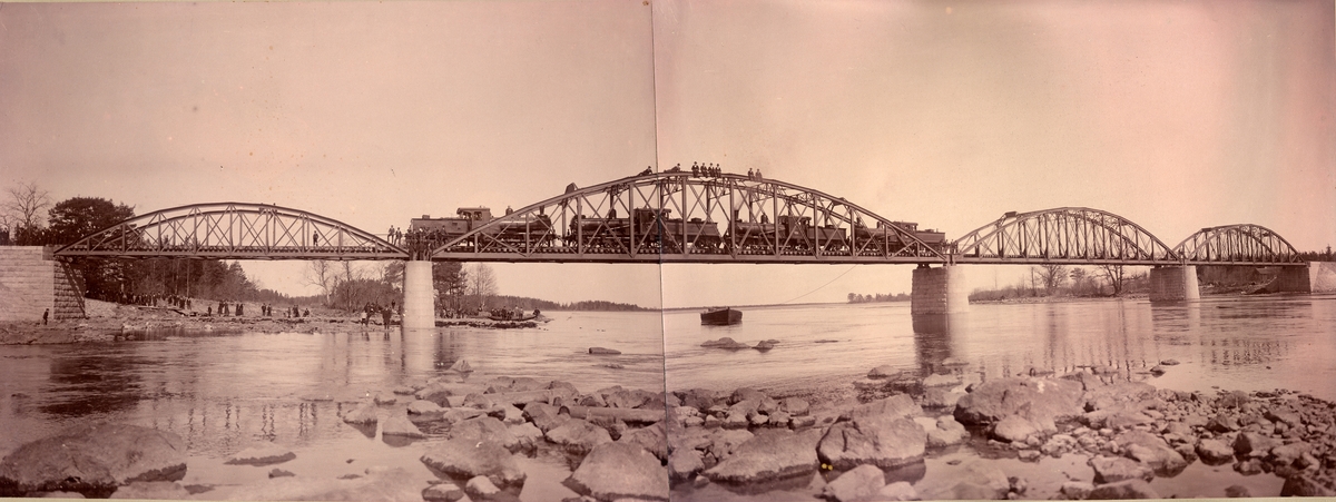 Provbelastning med 4st ånglok på bro över Dalälven år 1900. Loken är bl.a. SGGJ 1 och SGGJ 4. SGGJ 2 och 3 är förmodligen också med. Fotograf troligen Anders Vilhelm Ljunggren
