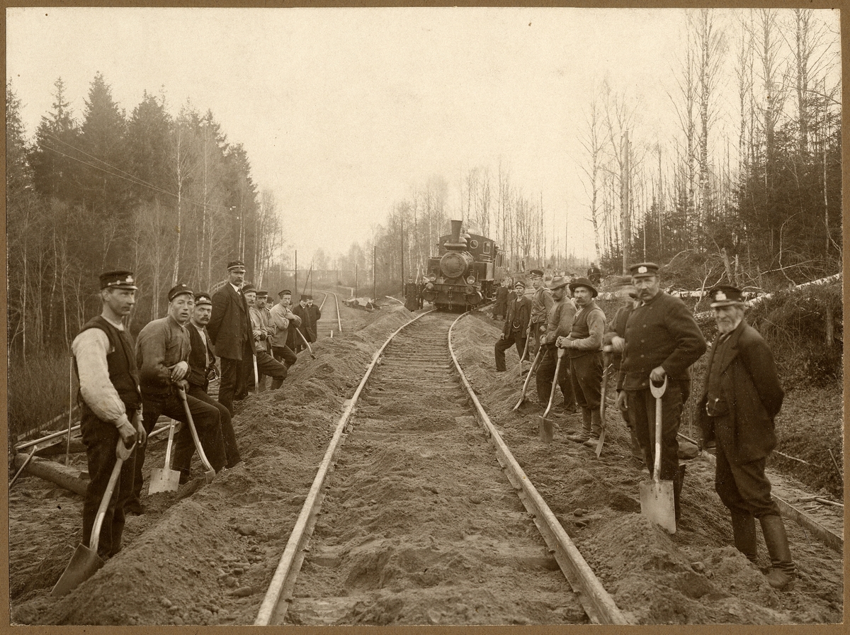 20 rallare med befäl vid spåret med ånglok och vagn i bakgrunden. Sista trafiken på den gamla Kil-Fryksta banan. Text på baksidan; Härmed fotografierna ifråga å baksidans högra översta hörn med blåpenna betecknade 1,2 och 3. Foto 1 och 2 utvisa den gamla och den nya linjen d.v.s. den till dåvarande Kil nedre synes till vänster. Nya linjen d.v.s. den till nuvarande Kils station till höger å foto 1 och 2; å foto 1 nya linjen således den å vilket loket befinner sig å foto 2 den å vilken flertalet befäl och manskap befinner sig samt grusvagnarna skönjas längst bort till höger. Foto 3 visar det sista tåg som gick gamla linjen från Kil nedre till Fryksta vilket skedde omkring kl 1 em den 31 okt 1906. Påföljande dag således den 1 nov 1906 nedlades Kil nedre