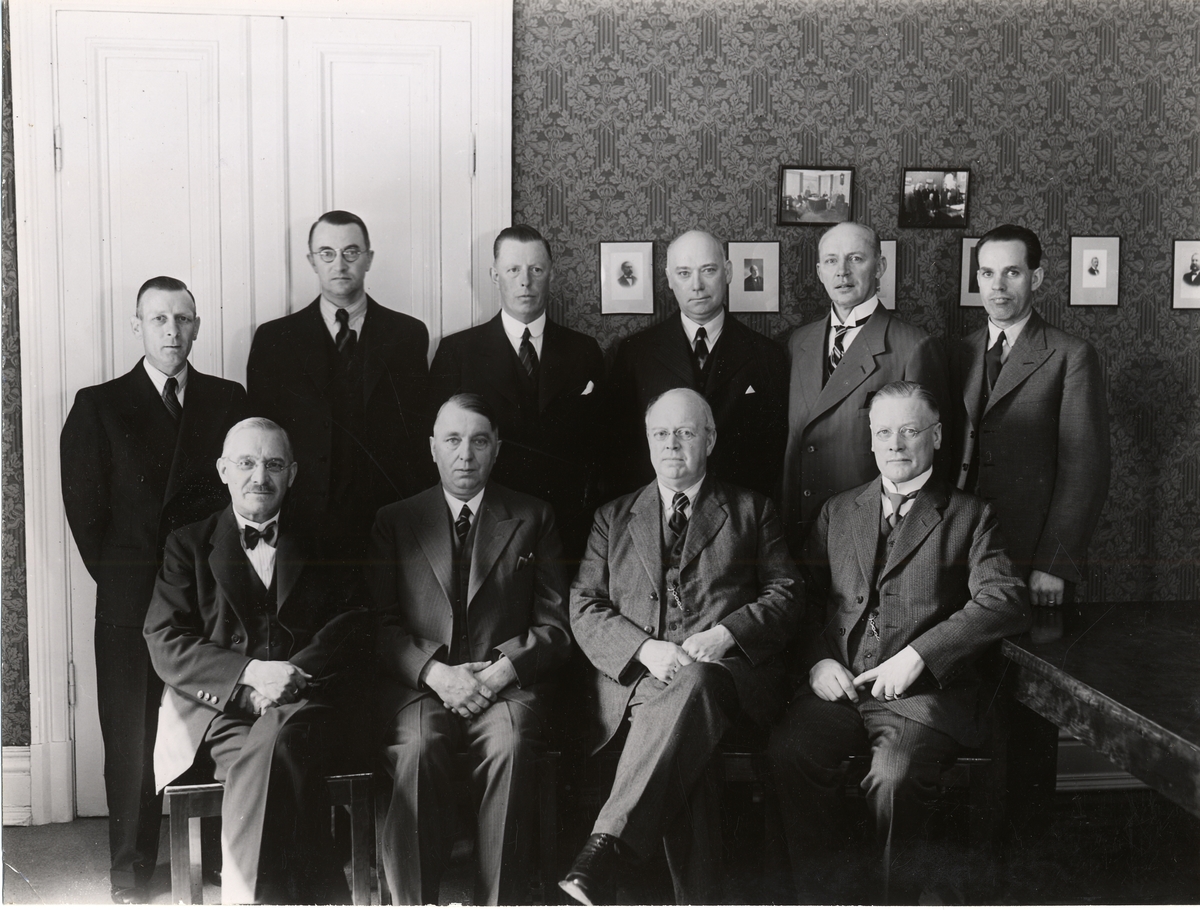 Tjänstemän på trafikexpedition i Örebro 1939. fr.v stins Nyström, Byråchef Lundin, Fl? Jankov, Quini, ???,Sts Nordström, Sts Berggård, Fts Högberg, Sts Trolinder, ??. Sts = Stationsskrivare,