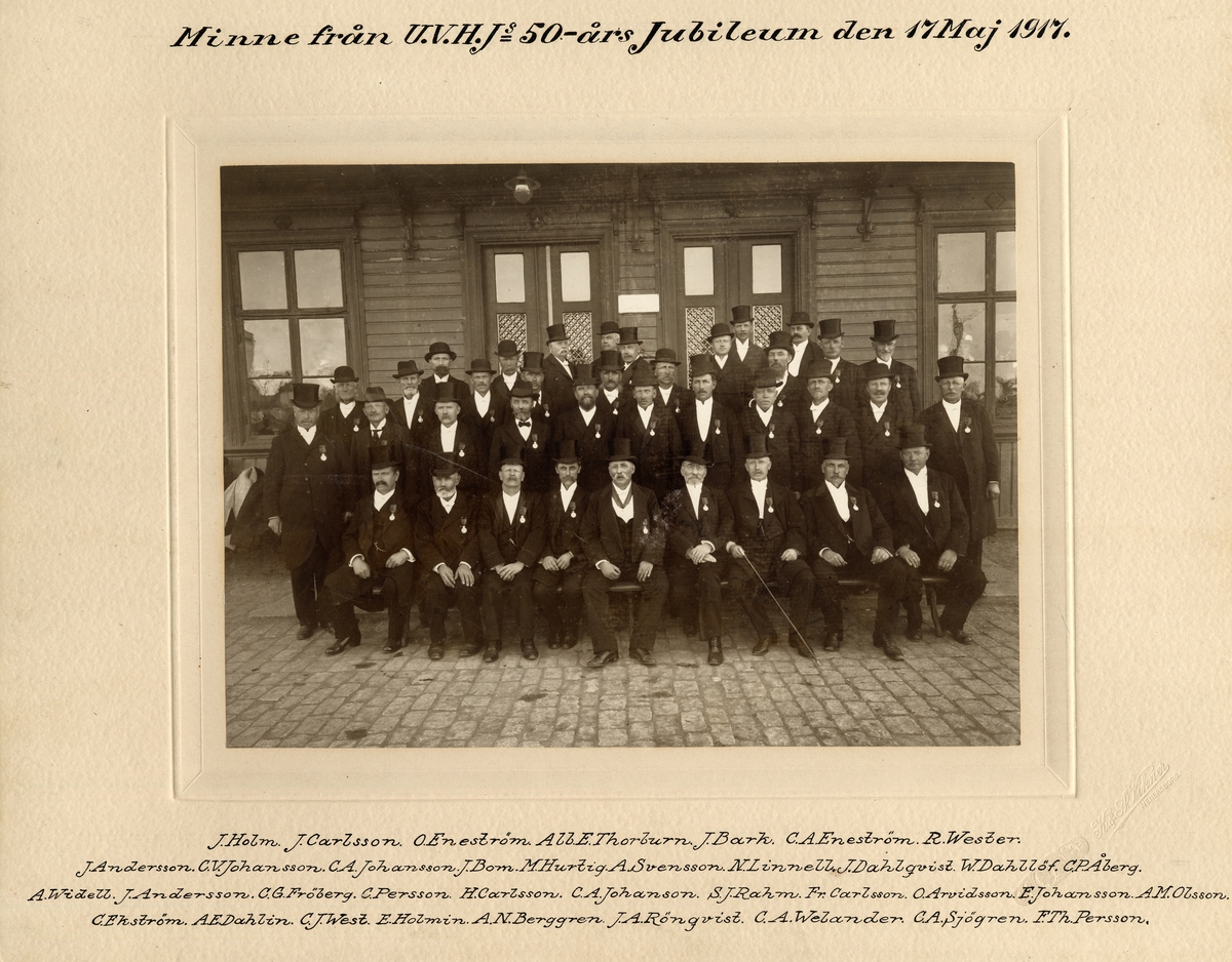Minne från UVHJ:s 50 årsjubileum 17 maj 1917. fr.v. J. Holm, J. Carlsson, O. Eneström, Alb.E. Thorburn, J. Bark, C.A. Eneström, R. Wester, J. Andersson,C.V. Johansson, J. Born, M. Hurtig, A. Svensson, N. Linnell, J. Dahlqvist, W. Dahllöf, C.P. Åberg, A. Widell, J. Andersson, C.G. Fröberg, C. Persson, H. Carlsson, C.A. Johansson, S.J. Rahm, Fr. Carlsson, O. Arvidsson, E. Johansson, A.M. Ohlsson, C. Ekström, A.E. Dahlin, C.J. West, E. Holmin, A.N. Berggren, J.A. Rönqvist, C.A. Welander, C.A. Sjögren, F.Th. Persson.