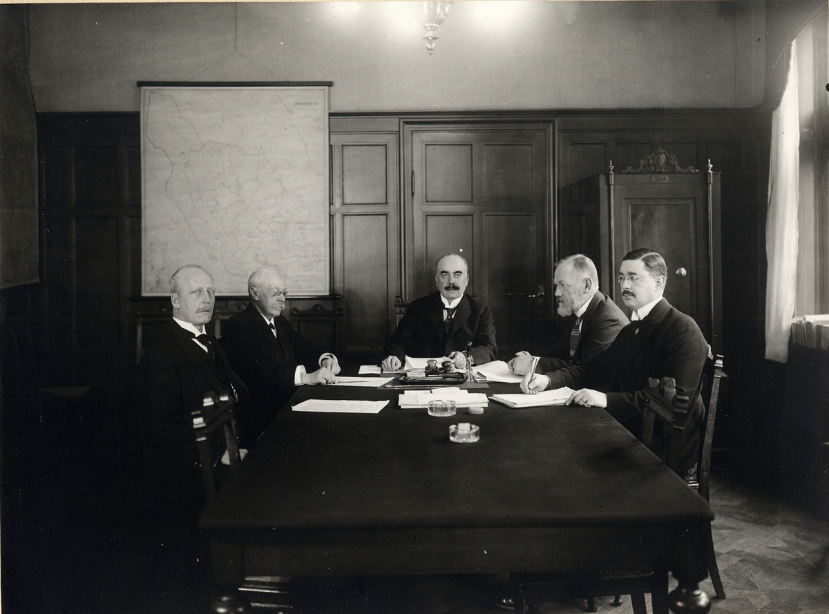 SWB:s förvaltningsledning 1920-34. fr.v. 1. ?, 2. ?, 3. vd dir G.O.L. Kamph, 4. bd W. Grandinson, 5. md S. Klemming