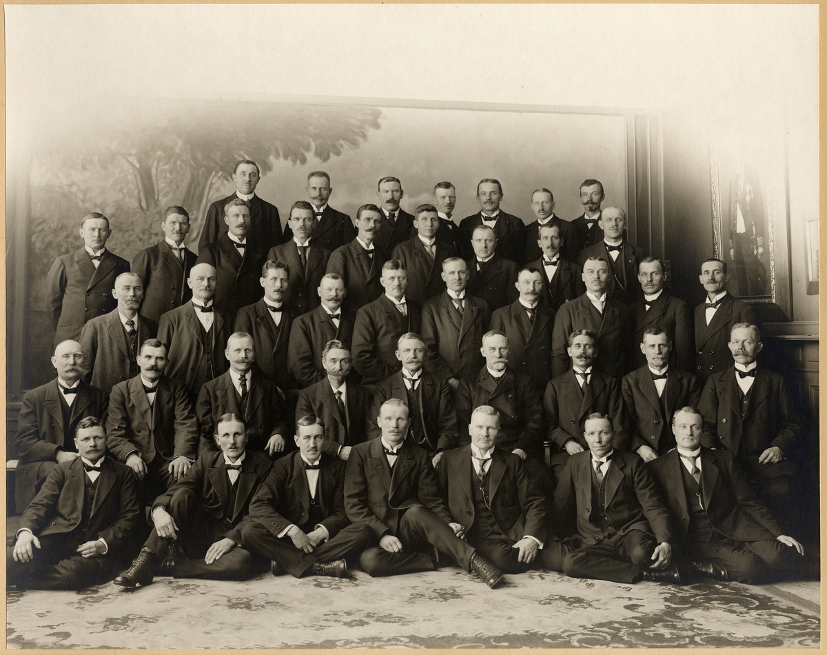 Strejkande lokmän vid UGJ februari 1919. Rad 1; Lf Samuelsson, Lf Ohlsson, Le Kling, Le John Nilsson, Lf Oskar Eriksson, Le Svensson, Le Rask. Rad 2; Le Bernhard Eriksson, Le Eriksson, Lf Brodin, Lf August Jansson, Lf Gustaf Lindhe, Le Gustafsson, Le Eriksson, Le Möller, Lf Ström. Rad 3; Lf Sjöström, Lf Simon Johansson, Lf Öström, Lf Sjögren, Lf Backström, Le Egerfält, Lf Lönnborg, Le Nordström, Lf P.O. Andersson, Le Gezelius. Rad 4; Lf Utter, Lf P.J. Andersson, Lf L.F. Johansson, Lf Dahlöf, Lf Hillblom, Lf Svensson, Lf Öbrink, Lf André, Lf Nyberg. Rad 5; Le Hedman, Le Enok Eriksson, Le Lundberg, Le Bernhard Nilsson, Le Sven Larsson, Lf Lönnkvist, Le Sågström.