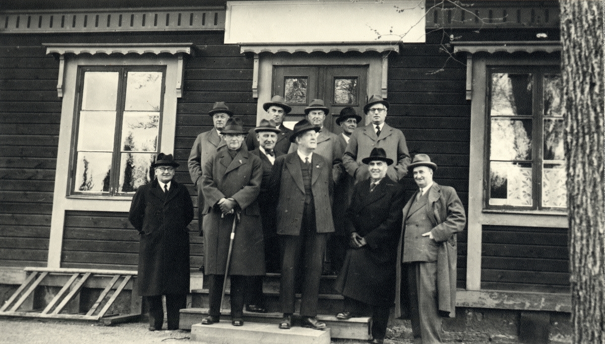 Tjänstgöringsnämnden framför Klackbergs gamla stationshus under resa 8/5 1945 över förutvarande SWB. Fr.v.; Tc Madison vid KNJ, Fti E.G. Mihnoss, Dc A. Valentin, Ti R. Hallgren (sekr), Lokf A.J. Malm, Brc Kurt Bergström (ordf), Öim W. Påhlsson, Tb E. Lund, Förbundsordförande S. Christiansson, Dc R. Markland och Ti H. Johansson.