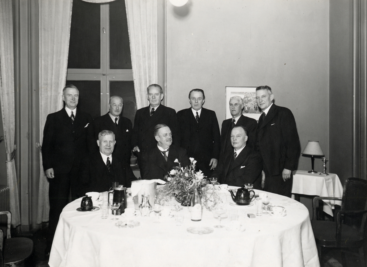 Tjänstgöringsnämnden samlad till avskedsfest 18/12 1941 för avgående medlemmarna sittande fr.v. förbundsordf A. Löfgren, fti O. Söderberg, lokf Hj Molin. Stående fr.v.; fmiö W. Påhlsson fti E.G. Mihnoss, ordf brc K Bergström, stfm C.A. Bergström, fbiö A. Poring (suppl) och sekr R. Hallgren.