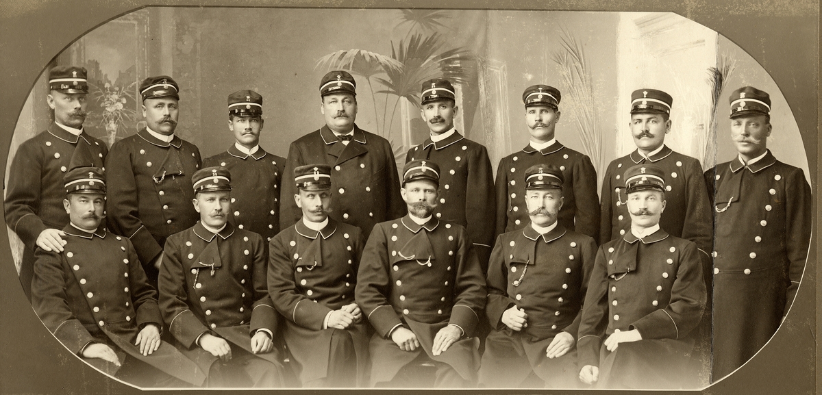 Konduktörerna i Sundbyberg den 30/7 1909. Sittande fr.v.; Karl Gustav Olsson, Erik Leonard Olsson, E. A. Hedberg, Gustaf Fredrik Leonard Söderberg, Axel T. Vesterberg, Axel Henning Bergh. Stående fr.v.; Edvard Danielsson, Klaes Edvin Jonsson, E. V. Eriksson, Karl Johan Larsson, Sven Magnus Kvist, Johannes Andersson, J. A. Bergkvist, A. J. Lindvall.