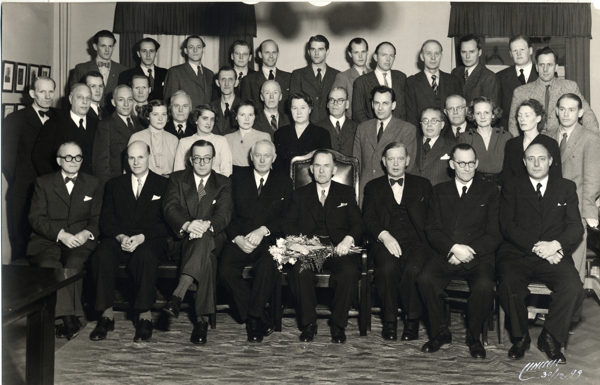 IV distriktets personal 1949. Sittande fr.v.; bra Gustaf Magnusson, tliö Bengt Wykman, ds Nils Johansson, fbiö Gustaf Wiberg, dc Carl Dahlberg, fmiö Karl Hendén, eiö Henry Eije, bilbra Gunnar Andersson.