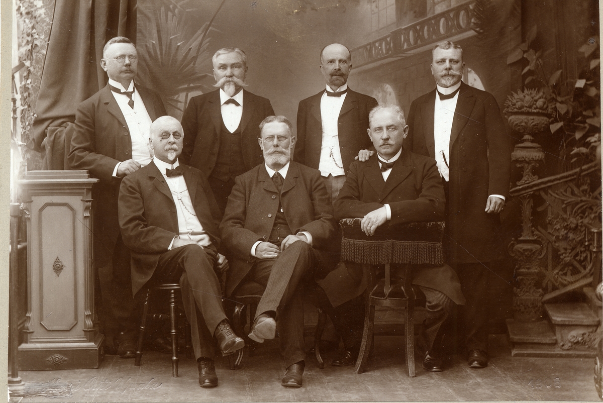 Stationsskrivare vid UGJ. Foto nr 4 av 6 som för början visar 10 st uppsagda stationsskrivare vid UGJ. De har därefter träffats vart 10:e år. Samma datum och samma tid för samkväm och fotografering. Fotografiet tagit 21/6 1908 i Uppsala. Nedre raden fr.v.; Greve Kalling, Victor Bergström, Pihl. Övre raden fr.v.; Hallenius, Johansson, Askerlund, Hagberg.