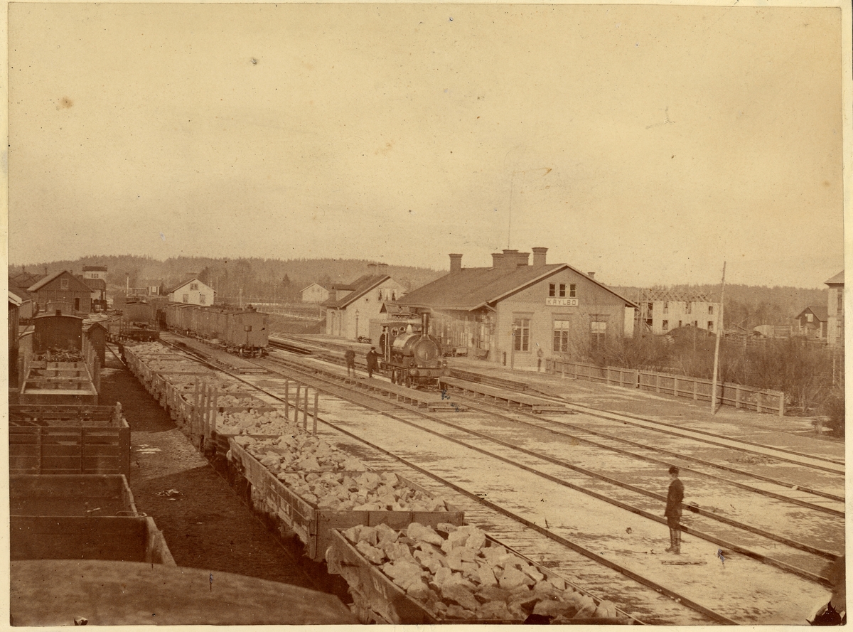 Krylbo järnvägsstation 1878 med text Torde uppsättas och förvaras genom Stationsinspektörens i Krylbo försorg å dennes expedition. Vid lok stående Lokförare Axel L Andersson, Stationskarlsförman Nils JohanPettersson, vid spåret Stationskarl Abrahamsson