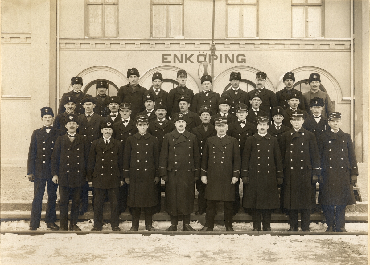 Inspektor Arvid Frunk med personal utanför stationshuset i Enköping 1921