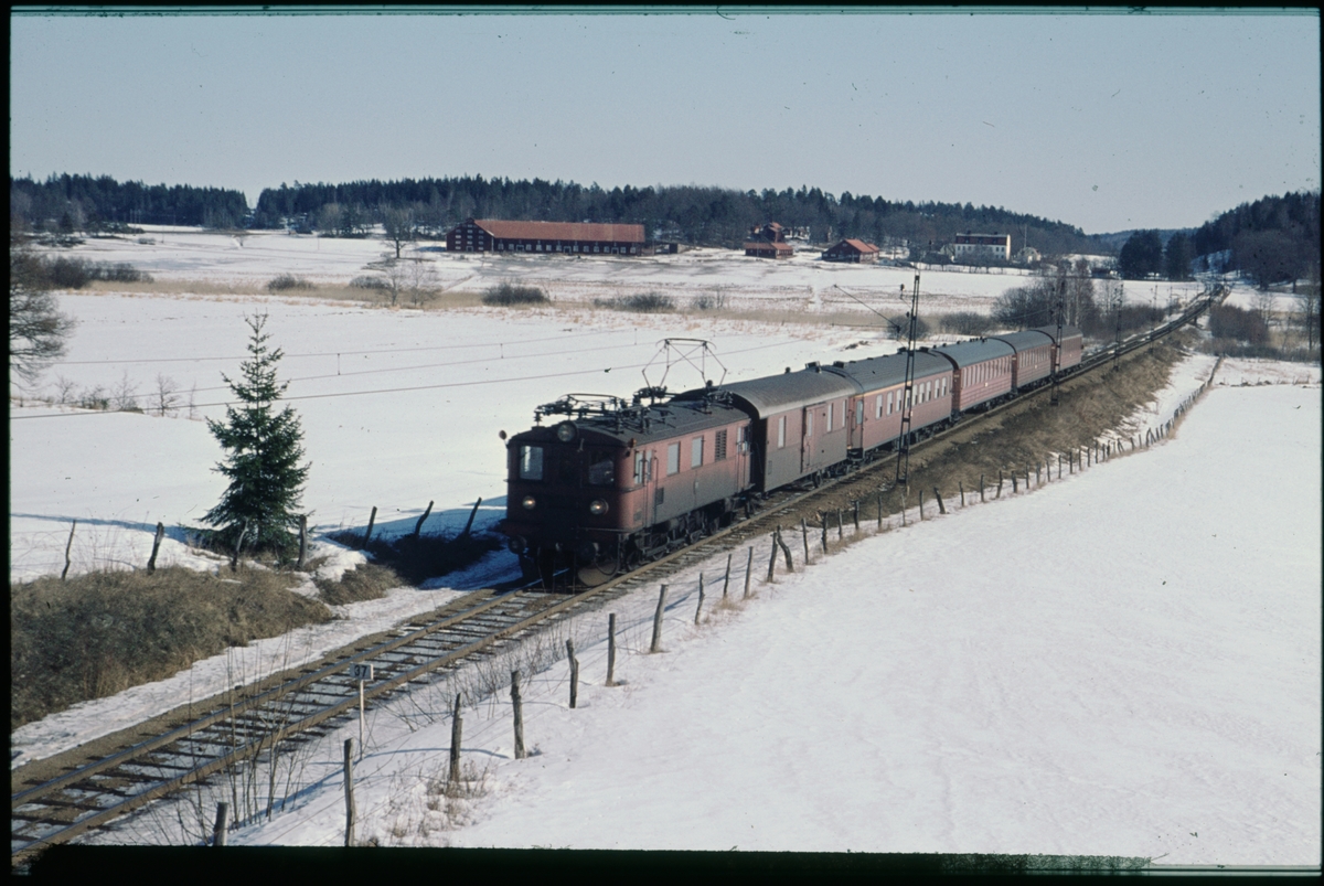 Persontåg dragen av ellok på linjen mellan Läggesta och Åkers Styckebruk.