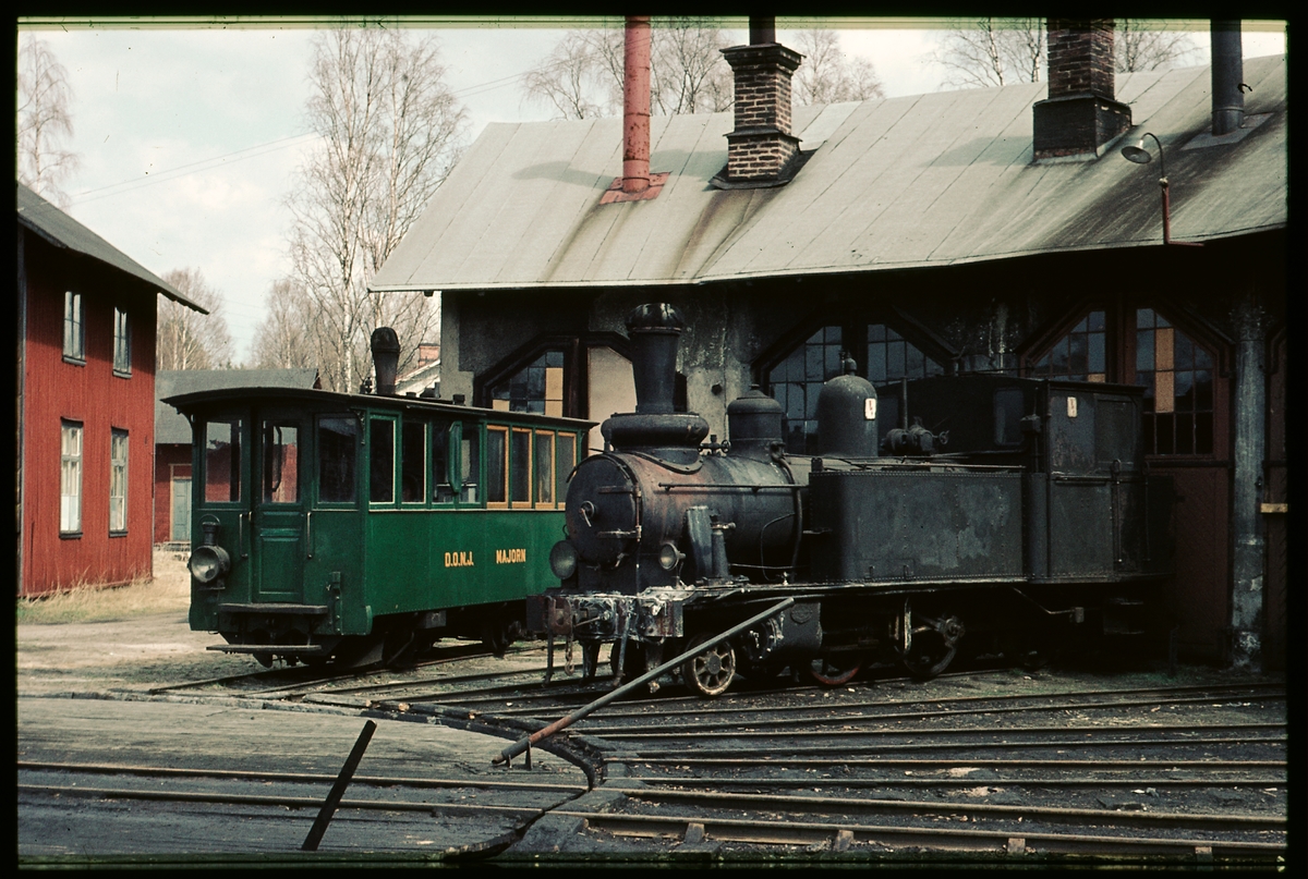 DONJ ångvagn "MAJORN" samt DONJ lok 13 vid Jädraås lokstall. Dala-Ockelbo-Norrsundets Järnväg.