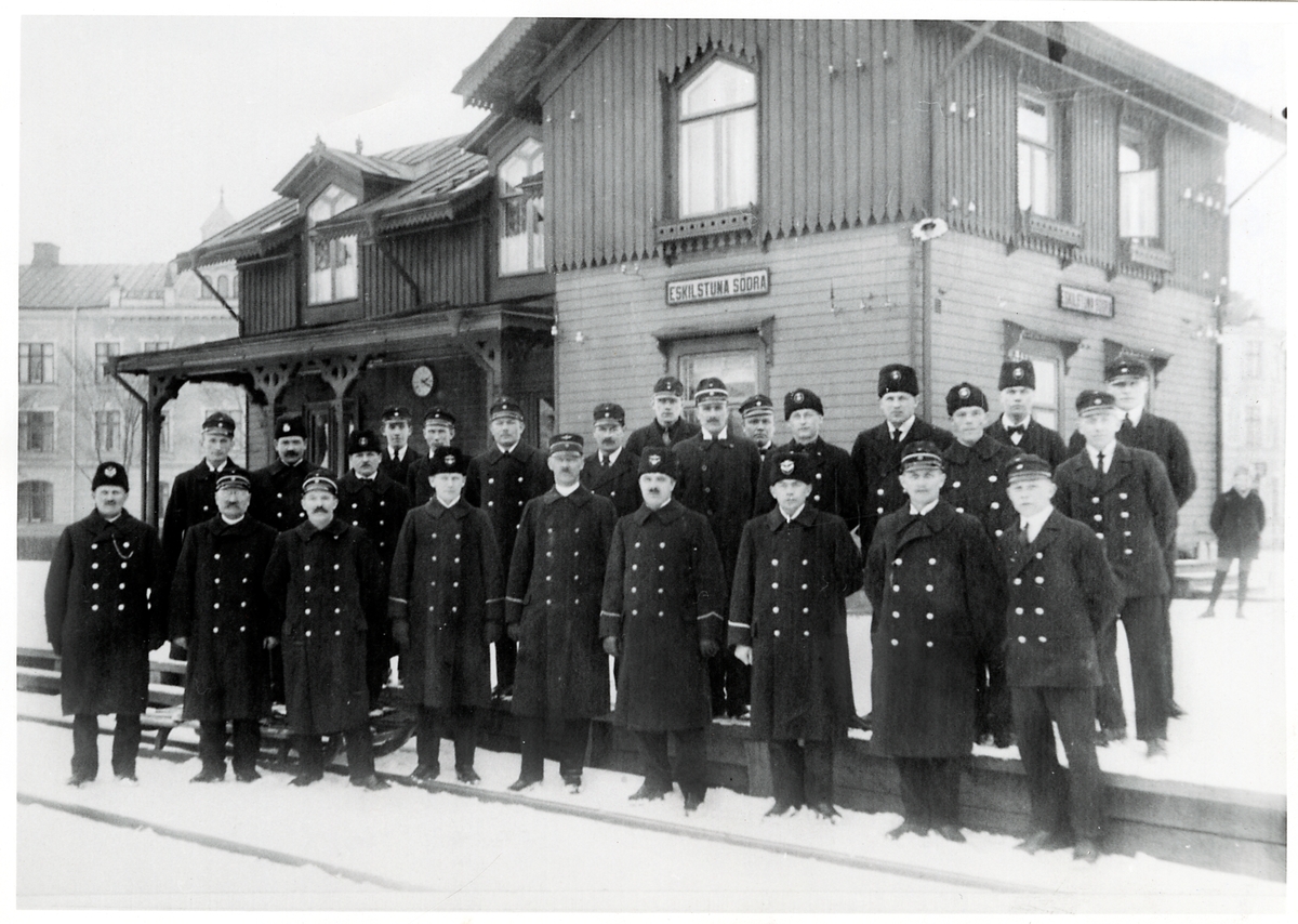 Personal utanför Eskilstuna Södra Järnvägsstation. Oxelösund - Flen - Västmanlands Järnväg, OFWJ.