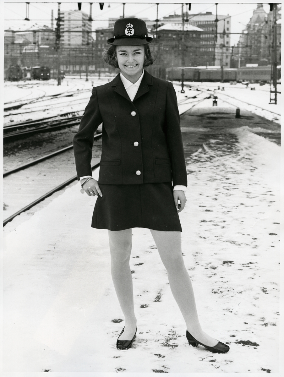Ny kvinnlig SJ uniform. Den nya kvinnliga SJ-uniformen utföres liksom den manliga efter senaste mode och med en förbättrad konfektionering.
