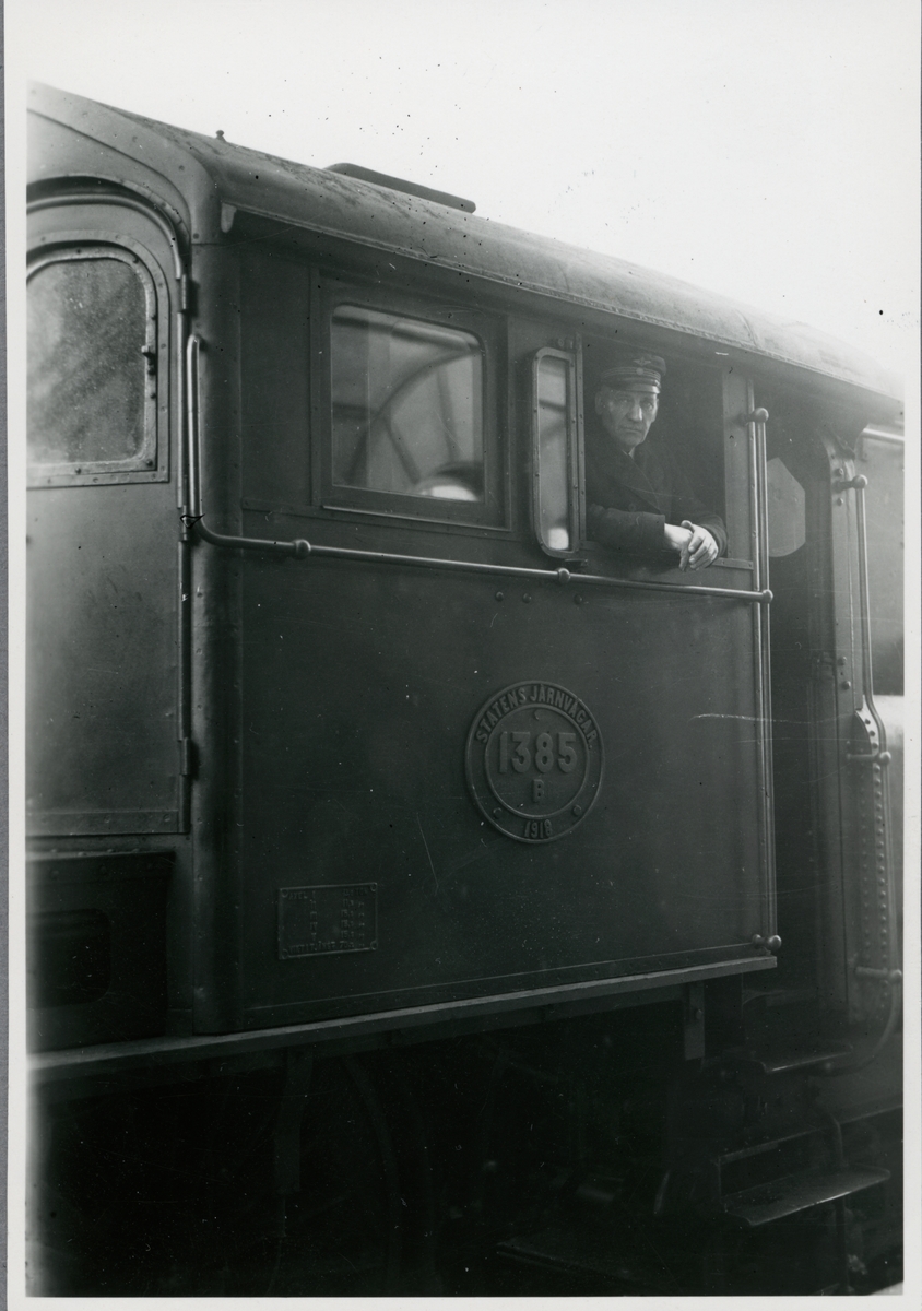 Lokförare i lokhytten på Statens Järnvägar, SJ B 1385.