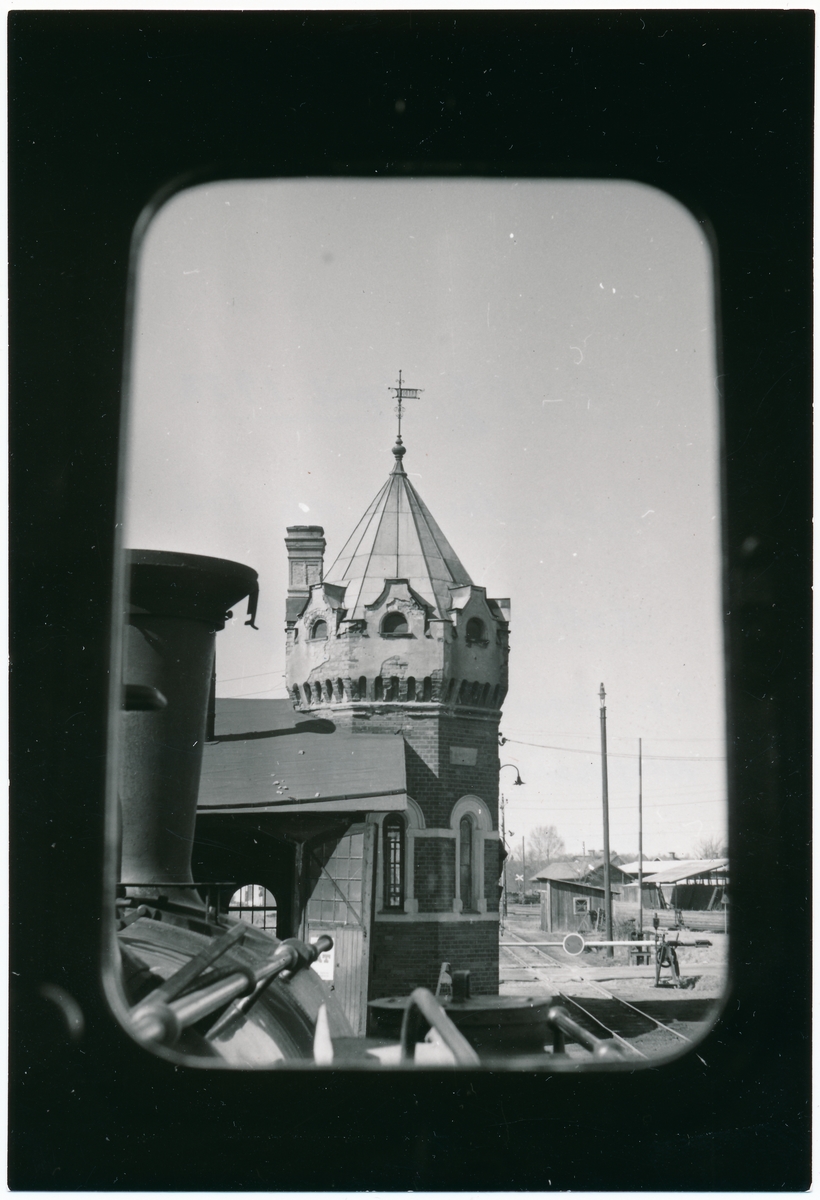 Vattentornet och lokstallet i Köping. Till höger kombinerad bom och stoppsignal vid Bellevuevägen.