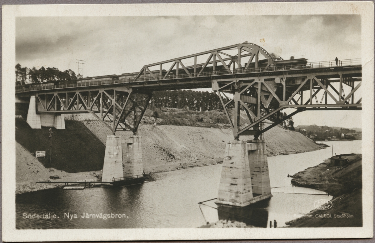 Järnvägsbro med passerande tåg över Södertälje kanal.