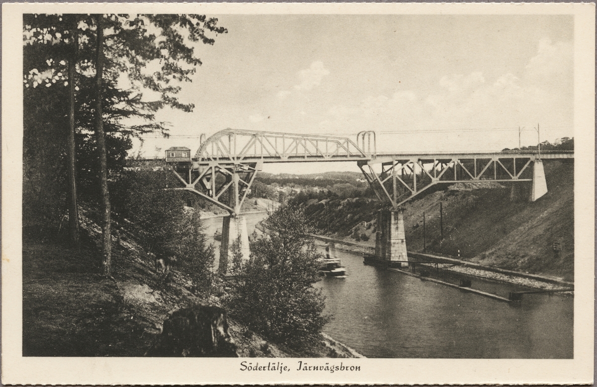 Vy på klaffbro för järnvägstrafik över Södertälje kanal.