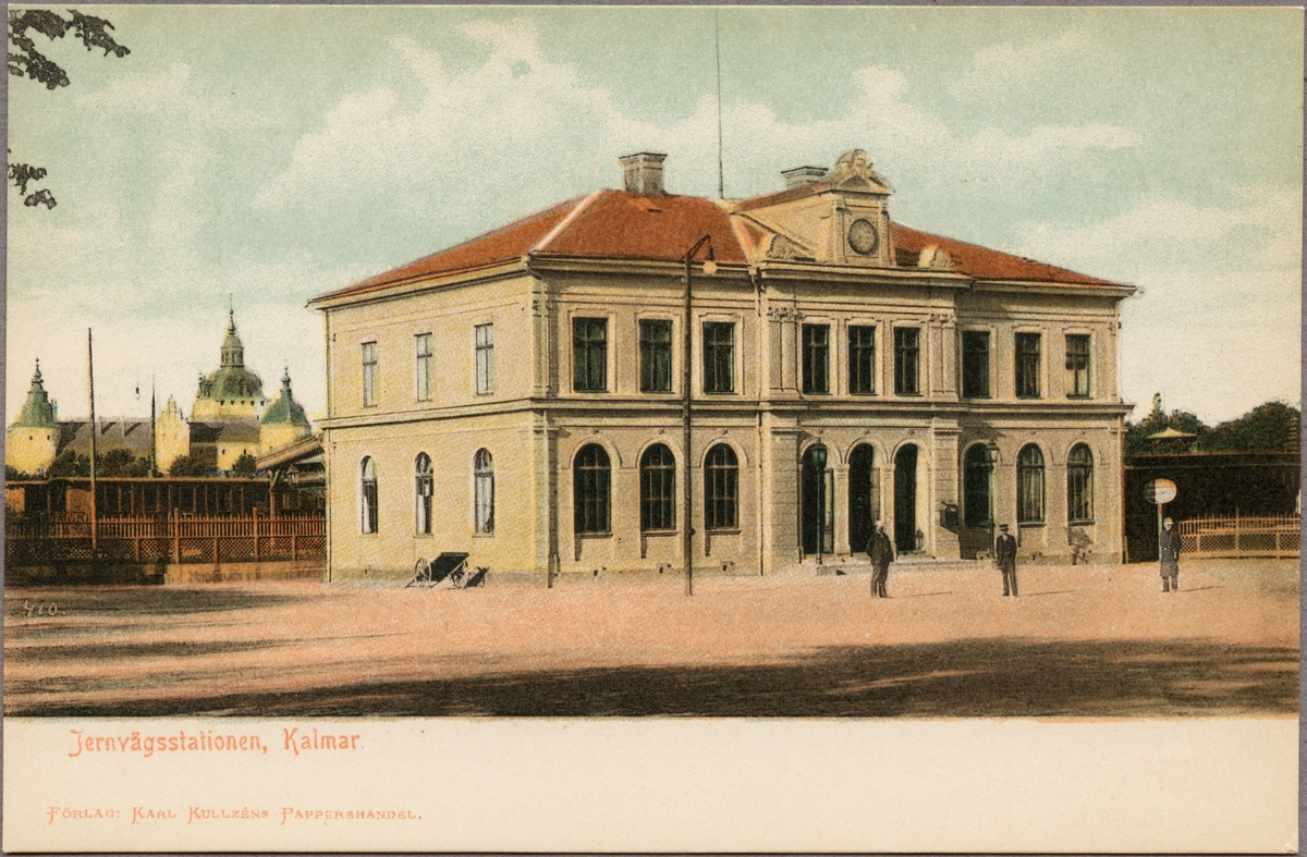 Järnvägsstationen i Kalmar med Kalmar Slott i bakgrunden.