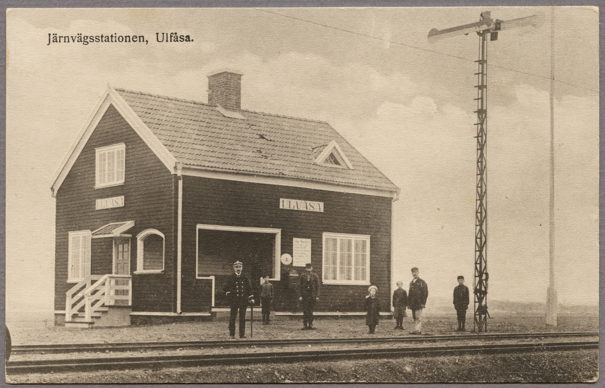 Spårsida av station med vy på barn och personal vid semafor och stationshus.