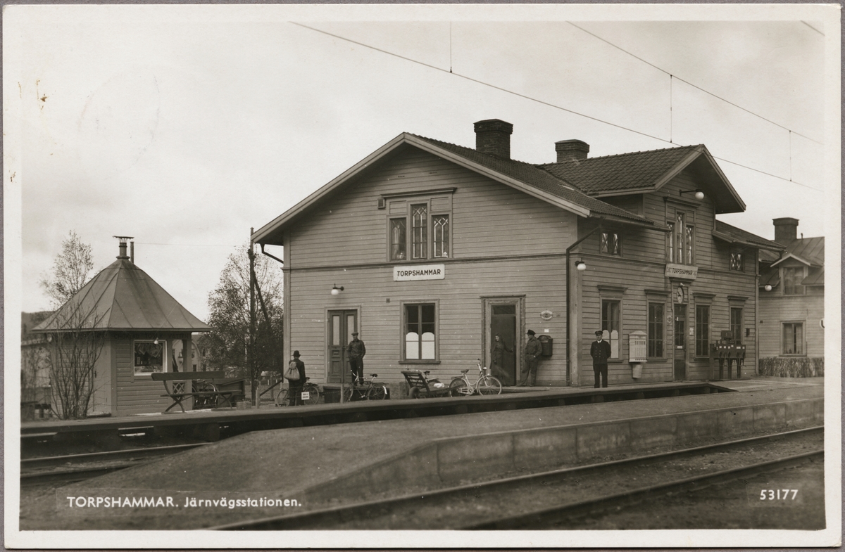 Stationsområde med vy på stationshus och resande på perrong.