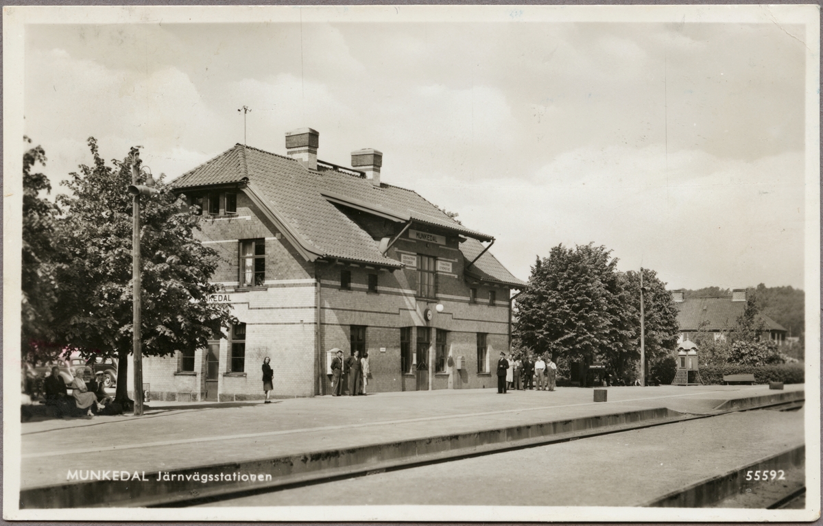 Spårsida av station med vy på perrong och stationshus med resande i bild.