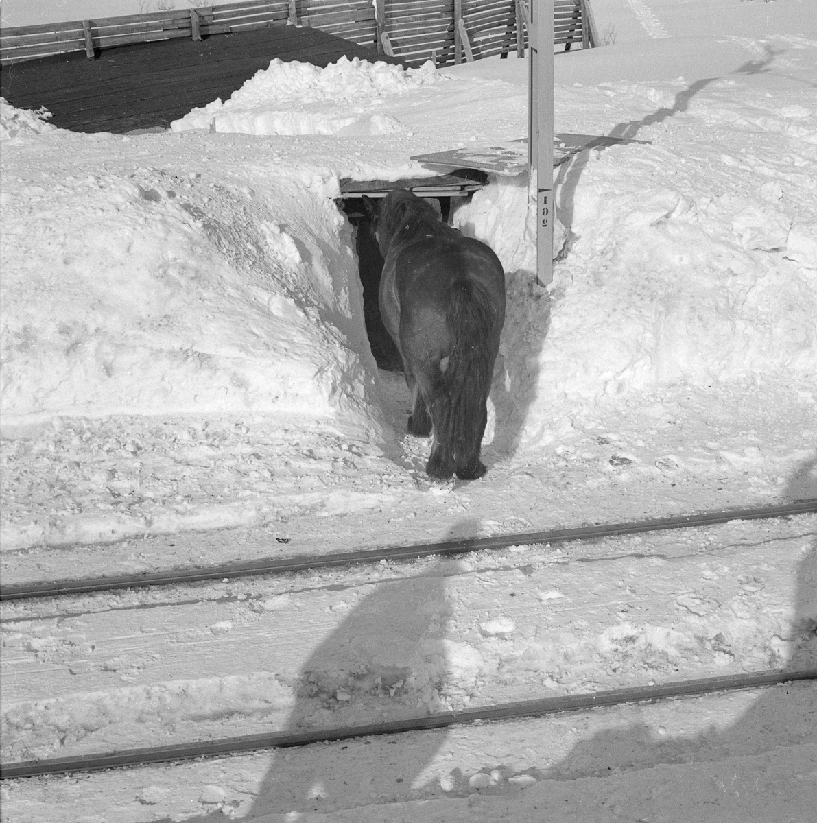 Häst på väg in i vinterstall vid Låktatjåkka. Stallet rymmer sex hästar.