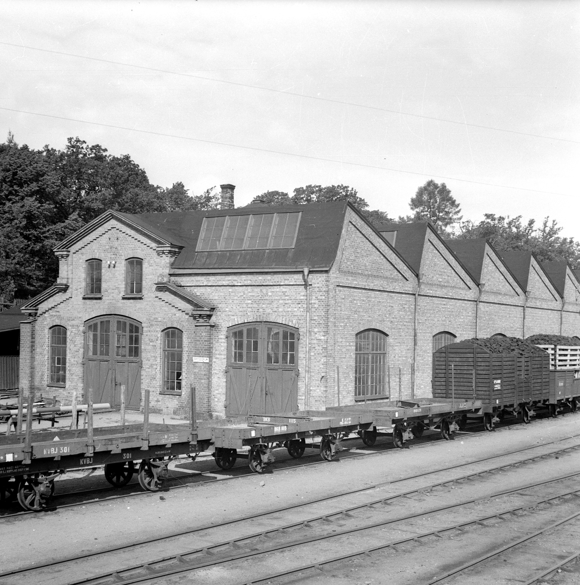 Karlshamns järnvägsverkstäder med diverse godsvagnar i förgrunden, bland andra KVBJ 301, BKB 1115, BKB 1128.