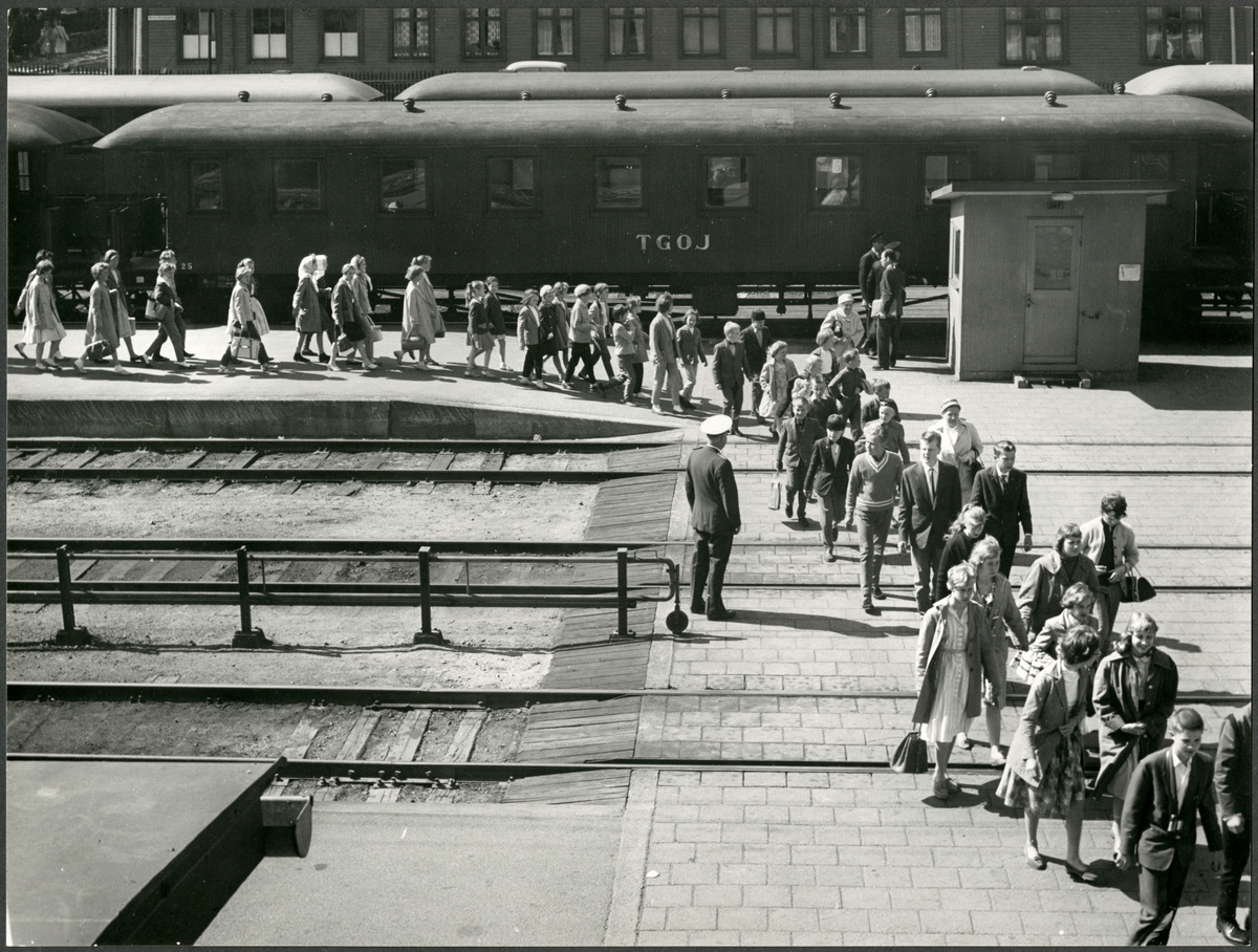 Skolbarn anländer Eskilstuna C för 300 års jubileum.
