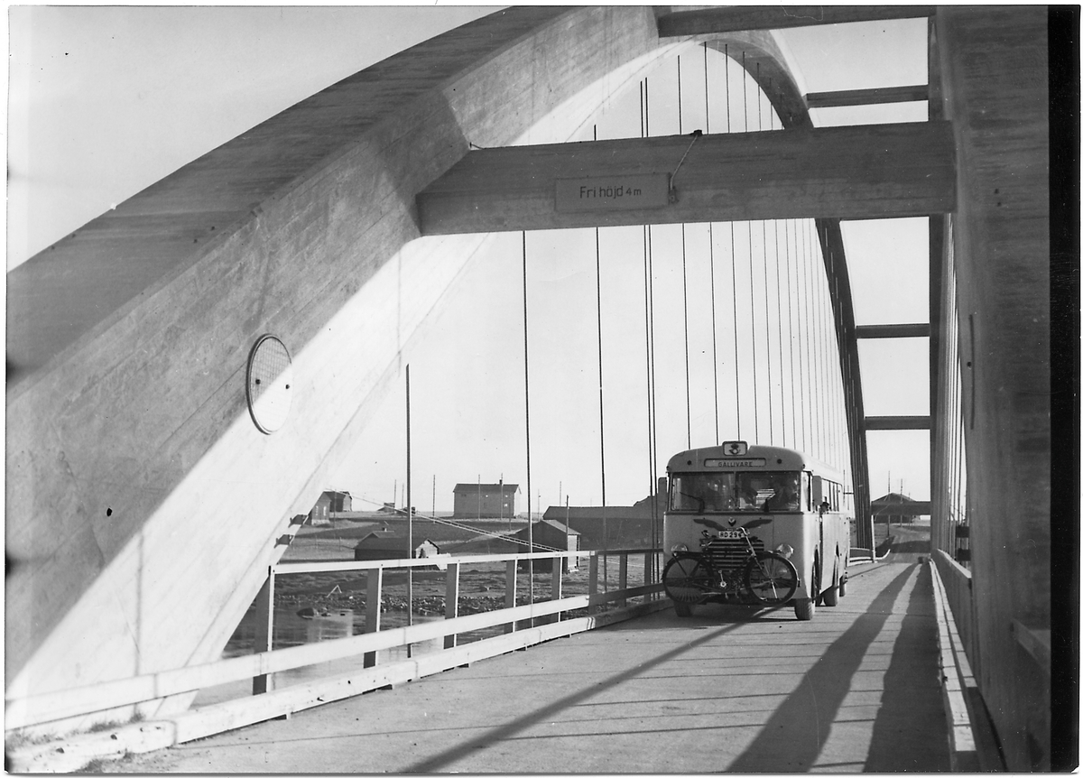 Postdiligens på linjen Gällivare - Tärendö - Pajala. Bussen passerar bron vid Tärendö.