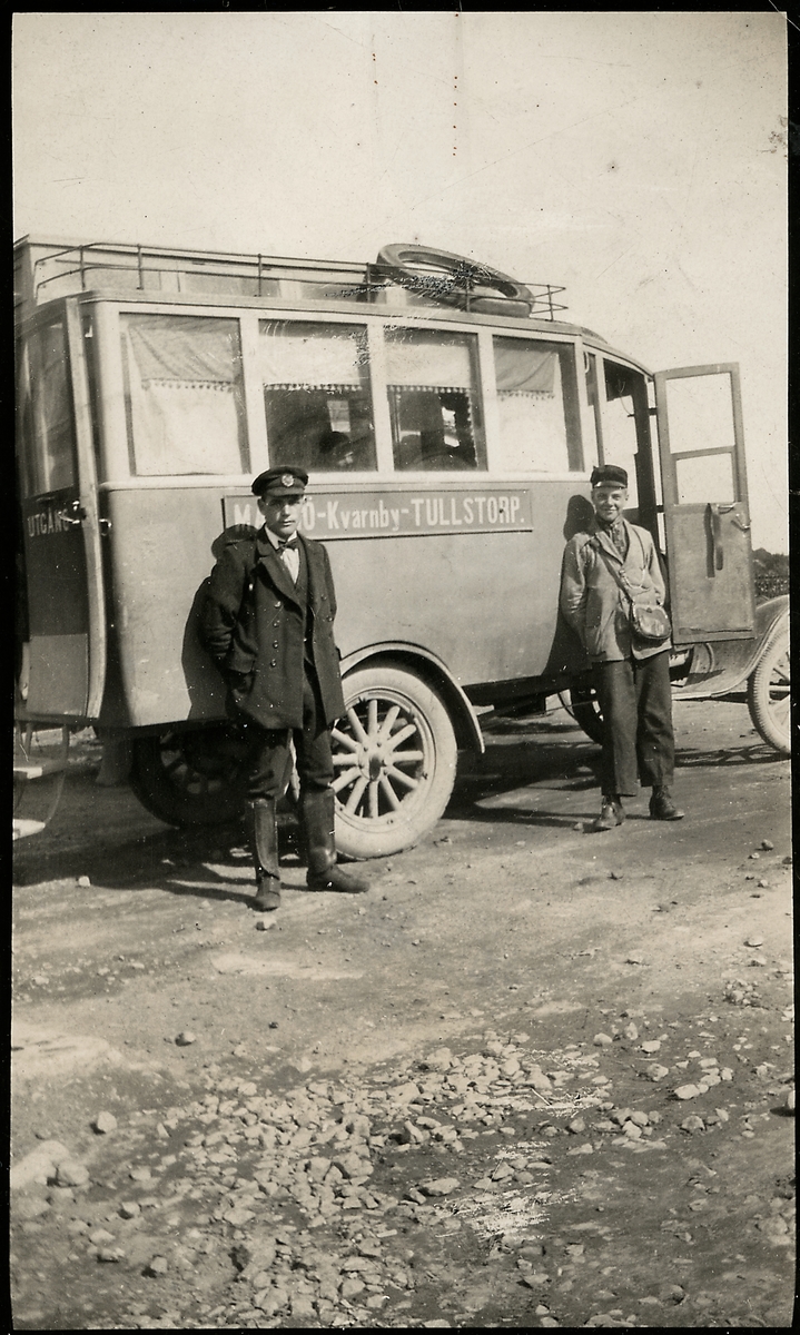 Titel: Chaufför och konduktör utanför en buss som trafikerar linjen Malmö - Kvarnby - Tullstorp år 1922.