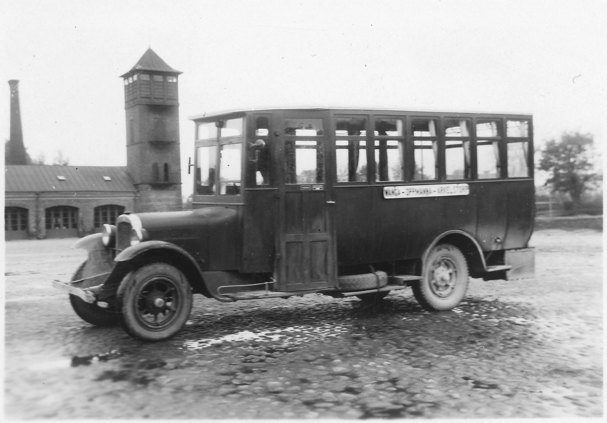 Buss parkerad på gamla Fisktorget. I bakgrunden brandstationen..
