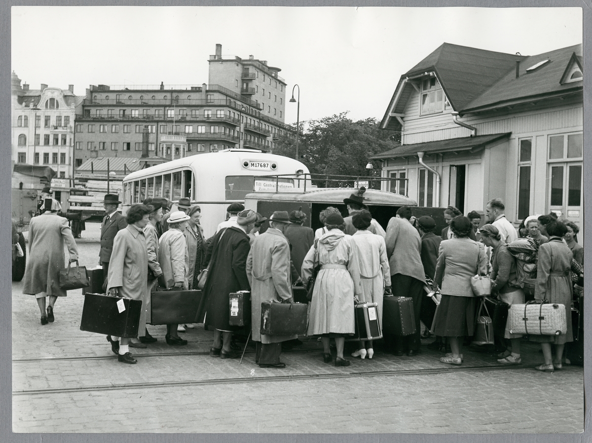 Statens Järnvägar, SJ turistbuss vid Malmö F. Lastning av bagage.