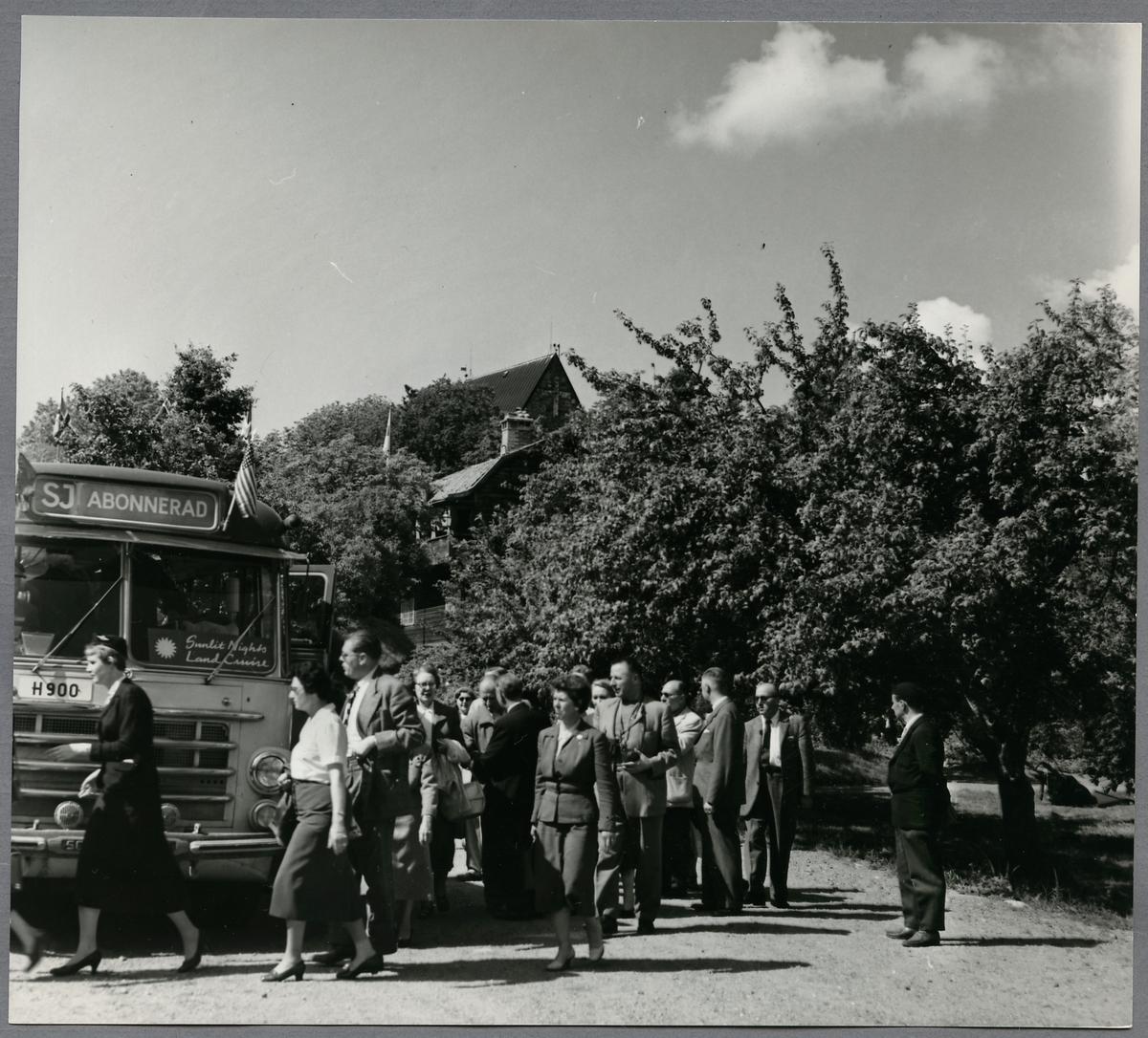 Statens Järnvägar, SJ buss, abonnerad för SNLE, Sunlit Night Land Cruise. Besök vid Odinsborg i Gamla Uppsala.