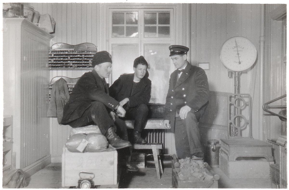 I bagagen på Repbäcken station. Från vänster, stationskarl Brodén, banbiträde Falk samt stationskarl Hedström.