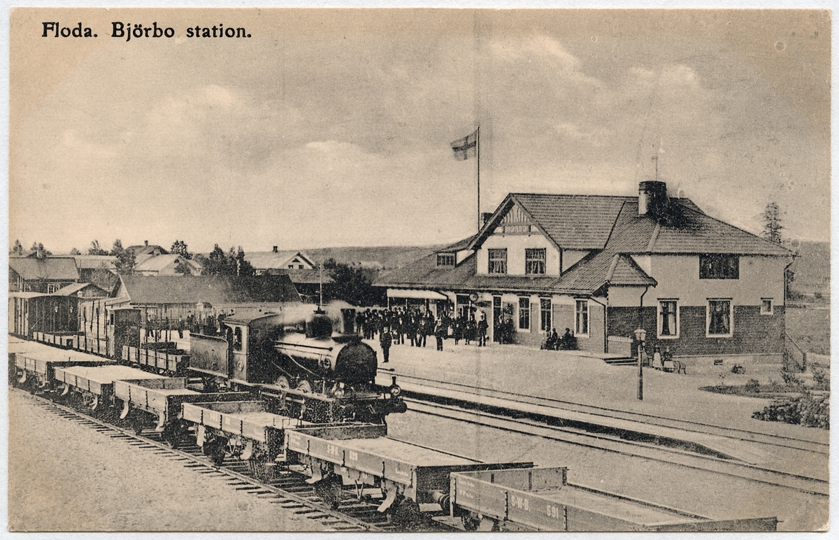 Björbo station. Stockholm - Västerås - Bergslagens järnvägar. SWB godsvagn 591, SWB godsvagn 528.