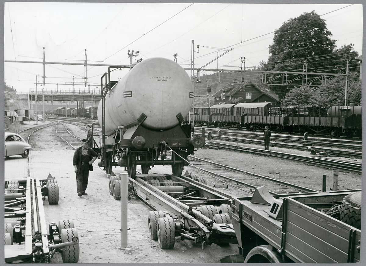 Lastbil med vagnbjörn för transport av tankvagn på Södertälje Centralstation.