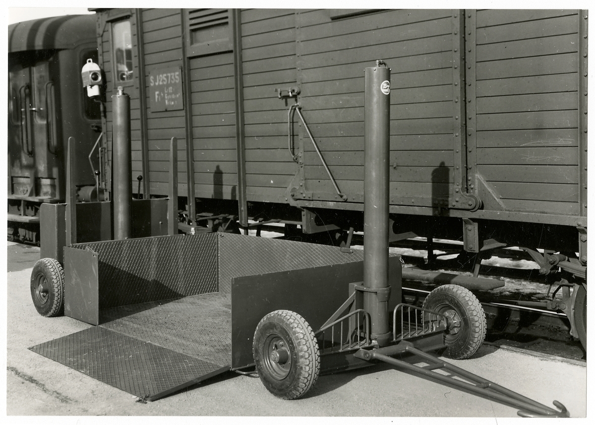Plattformsvagn med höj- och sänkbart flak. Statens Järnvägar, SJ F 25735.