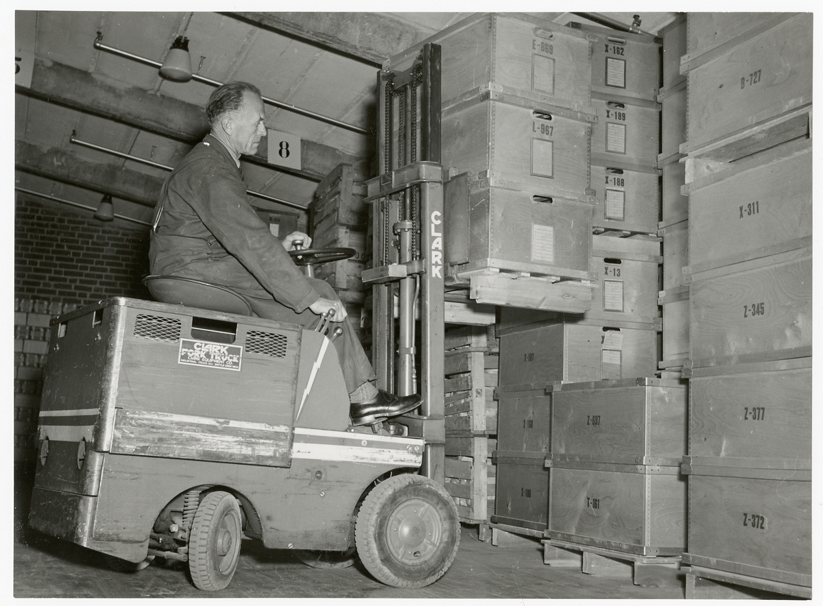Godshantering med truck, CLARK i Åkerholmska magasinet, Hammarby.