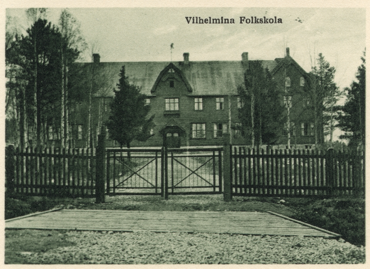 Vilhelmina Folkskola uppförd under åren 1917-1918. Vykort från F.H. Sörlins Pappershandel Vilhelmina.