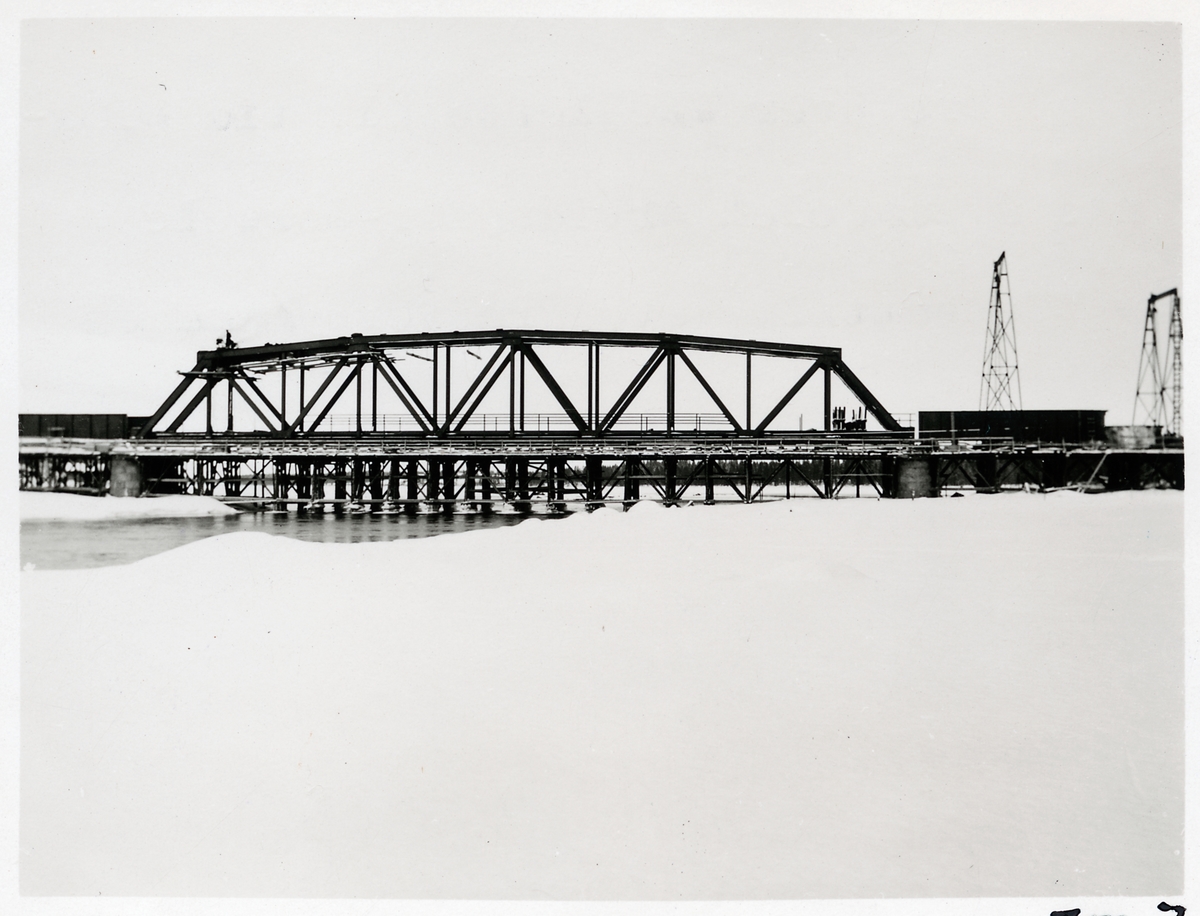 Brobygge över Skellefteälven vid Slagnäs på linjen mellan Sorsele och Arvidsjaur vintertid.