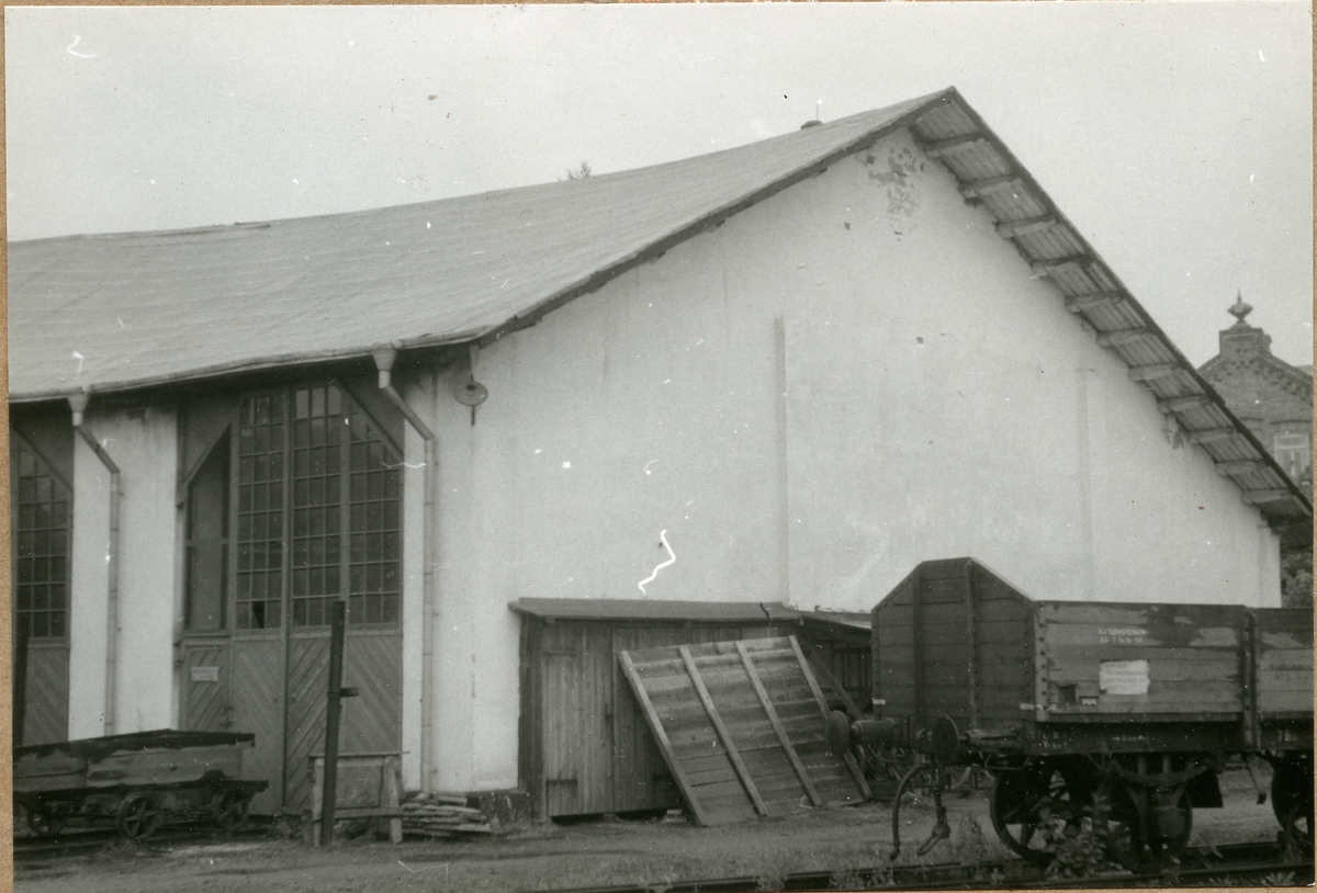 Sida av lokstall med vagn i bild.