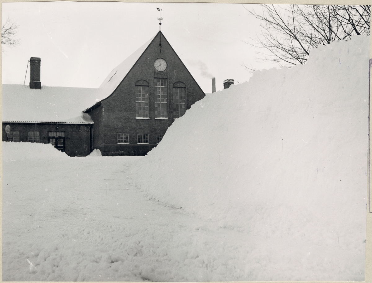 Väg och snövall vid stationshus.