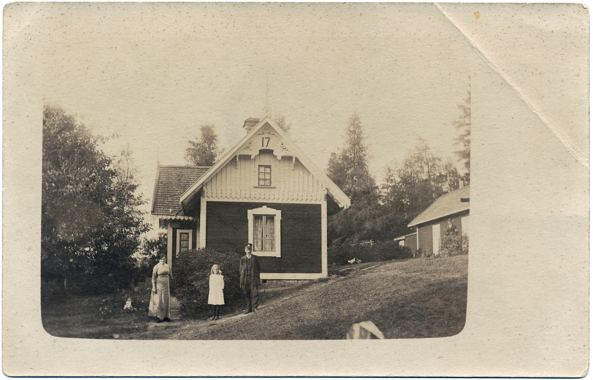 Banvakt Johan Wååg med familj utanför banvaktsstuga 17 i Viludden.