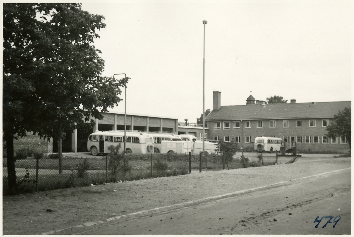 Statens Järnvägar, SJ buss och släp framför garaget.